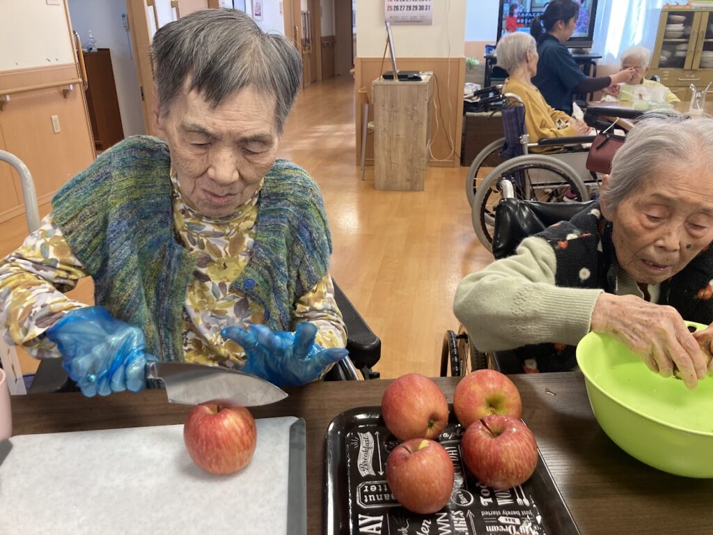 あ、こちらのおばあさまはご自分の味見用にリンゴを切られていたご様子です(笑)