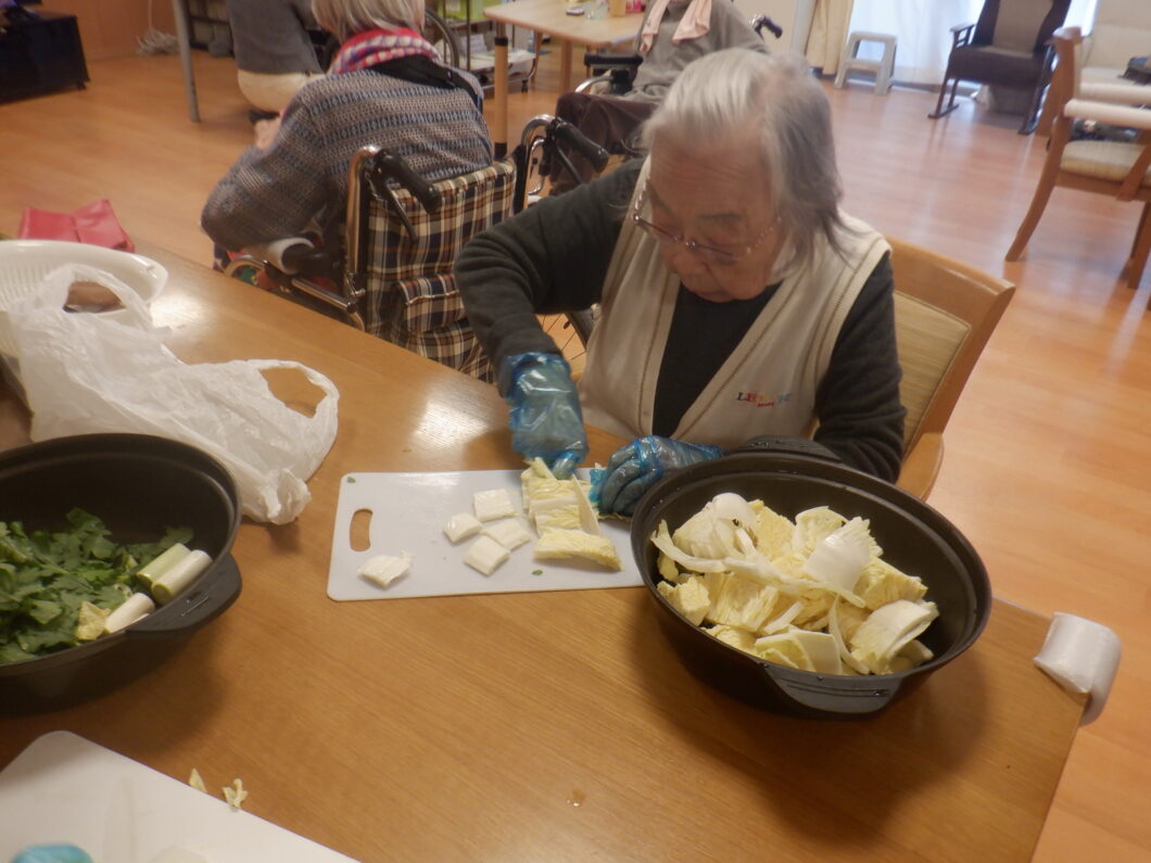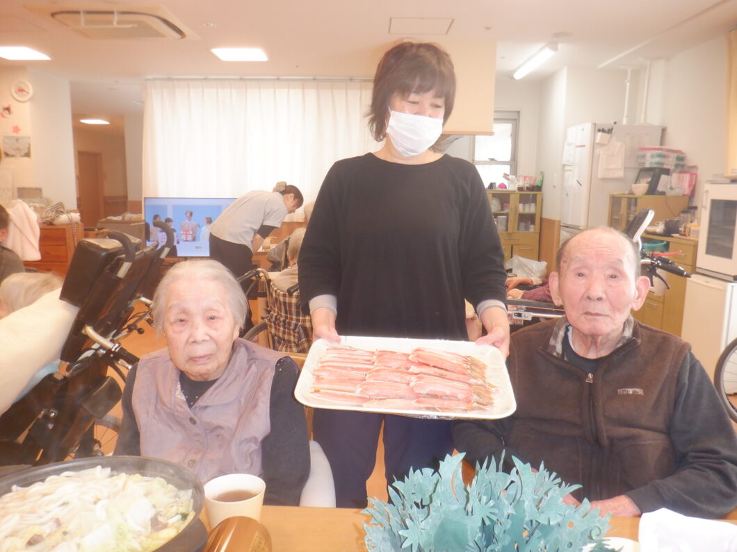 というわけで、開催されたカニ鍋。最近食事量が減っている方もおられたため、まだまだ寒いこの時期、美味しいお鍋で体も心もほこほこになって頂こうと企画。
