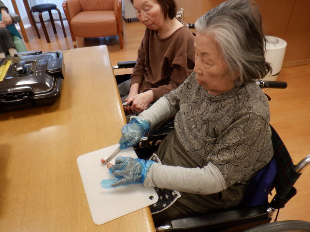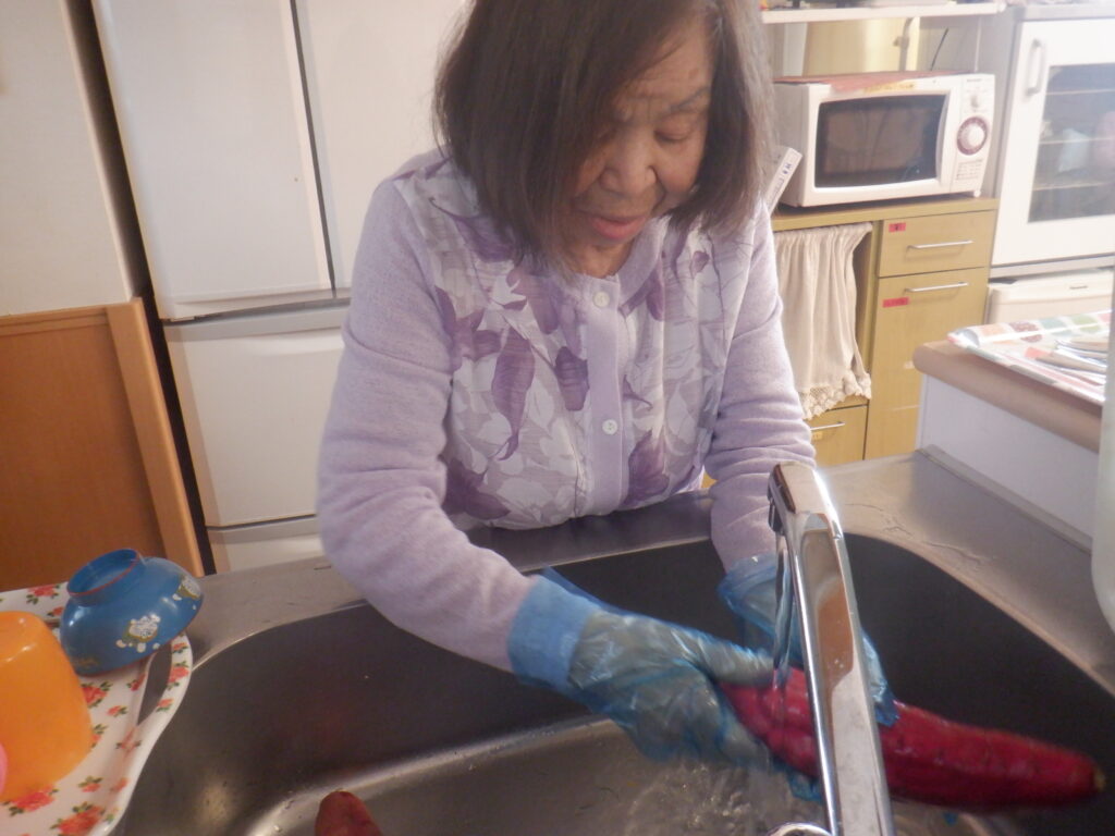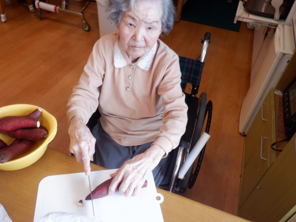 前回参加出来ずであった方が参戦して頂け、職員は芋の皮をむきやすいようにピーラーをお渡ししますが、まぁ危ない。使い慣れていないことが分かり、包丁をお渡しすると、するすると使用。