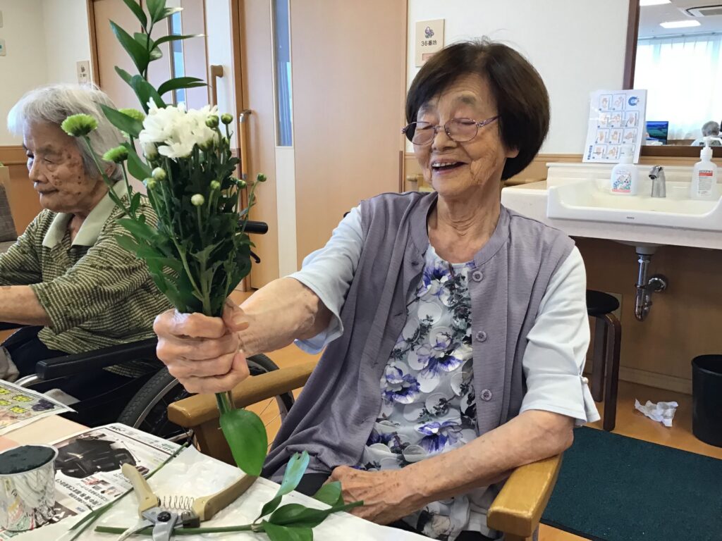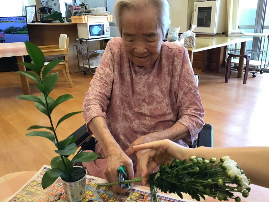 【9月14日 2・6階合同生け花】 今月も7人の入居者様が集まり、賑やかに開催されました。 普段から交流のあるM様とT様の息の合った掛け合いに笑いが絶えない和やかな雰囲気の中、皆様思い思いに生けておられます。