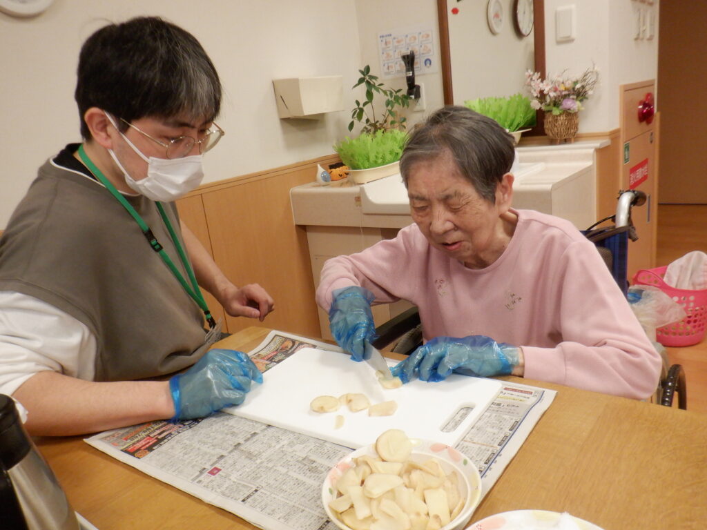 「昔も作ってたよ思い出すわ」と包丁片手に語られる方、「こういうの好きなんよ」と好みを語って下さる方、「母国でもショウガを紅茶に入れて飲んでいたよ」と異国文化を教えてくれる職員